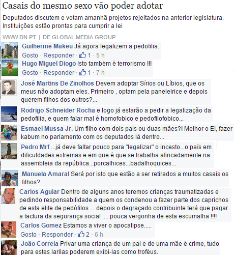 Eu compreendo que o conceito haver casais do mesmo sexo faça confusão a algumas pessoas. Estão demasiado ligadas ao conceito de «família tradicional». E acho que algumas não estão a conseguir «engolir» esta recente notícia, porque ainda não se habituaram à ideia de que há amor entre pessoas do mesmo sexo. Contudo, não compreender, ou ser contra, não lhes dá o direito de fazer comentários tão rudes, parvos e maliciosos.